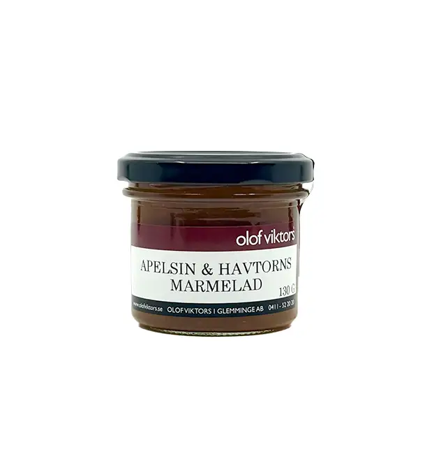 Den beste marmeladen med Havtorn (Tindved) vi har smakt. Her har Olof Viktors virkelig truffet innertier og kombinerer den syrefriske havtornen med de beste appelsinene. Som alt annet de lager er den kokt i små batcher i kobbergryter over åpen flamme. Perfekt på toast, sammen med en fet og god rillettes eller som tilbehør til oster.