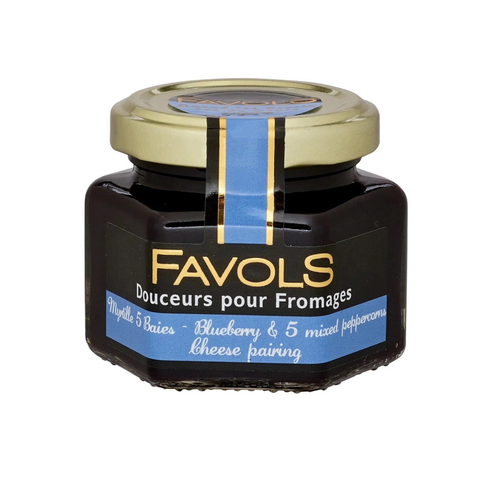 Blåbærene som benyttes I dette tilbehøret høstes i de samme fjellområdene der man produserer de store faste franske ostene. Det er tradisjon for å servere ost og blåbærsyltetøy til frokost. Kombinasjon med 5 pepper gir syltetøyet enda ekstra piff og gjør det enda mer egnet til de gode modne fjellostene. 110 g