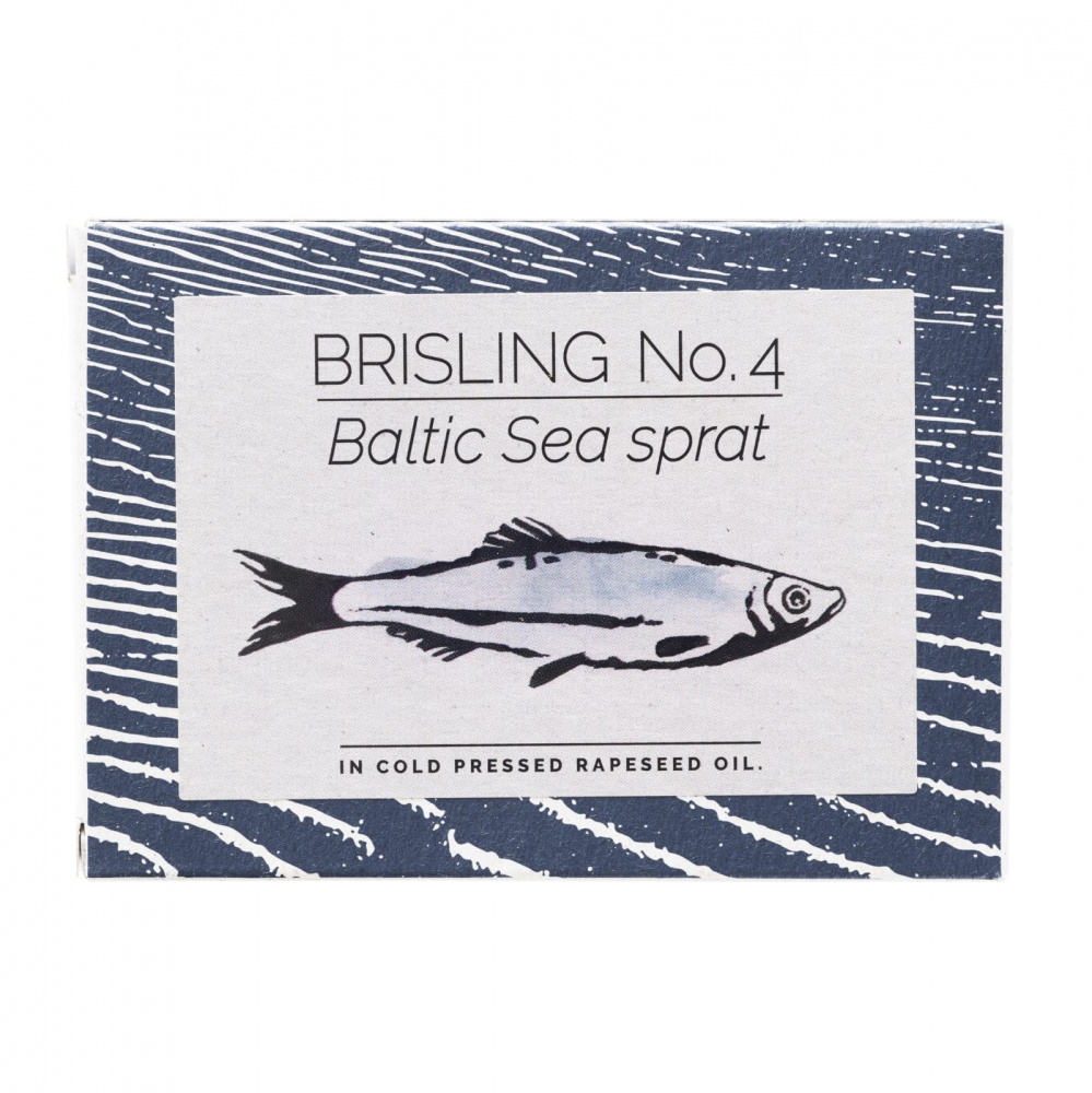 Lett-tørket Østersjøbrisling håndlagt i boksen, med kaldpresset rapsolje fra Bornholm som er krydret med allehånde og nellikspiker.