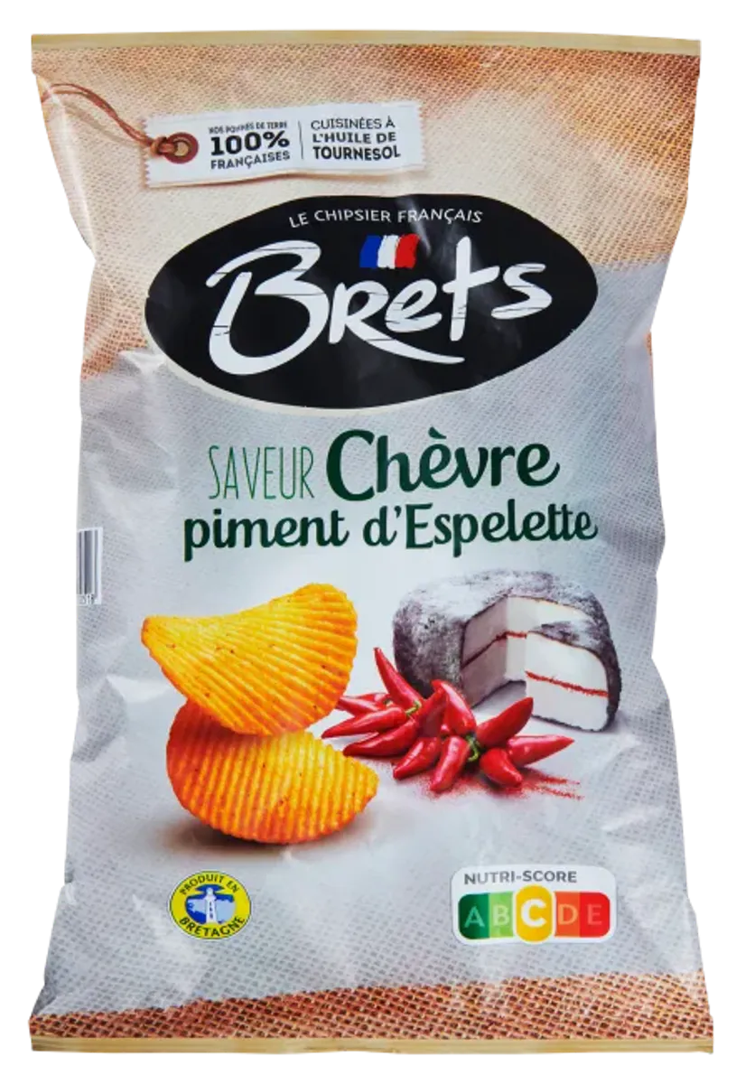 Brets potetchips med smak av chevre og Espelette chili, er laget av utvalgte franske poteter fra Brittany. Skivene stekes forsiktig og langsomt i solsikkeolje og er smaksatt med chevre og chili. Potetchipsen er ekstra sprø og har riflede skiver. Kan nytes alene som snacks, som tilbehør til en sandwich, til en burger eller nyt det sammen med noe godt i glasset.