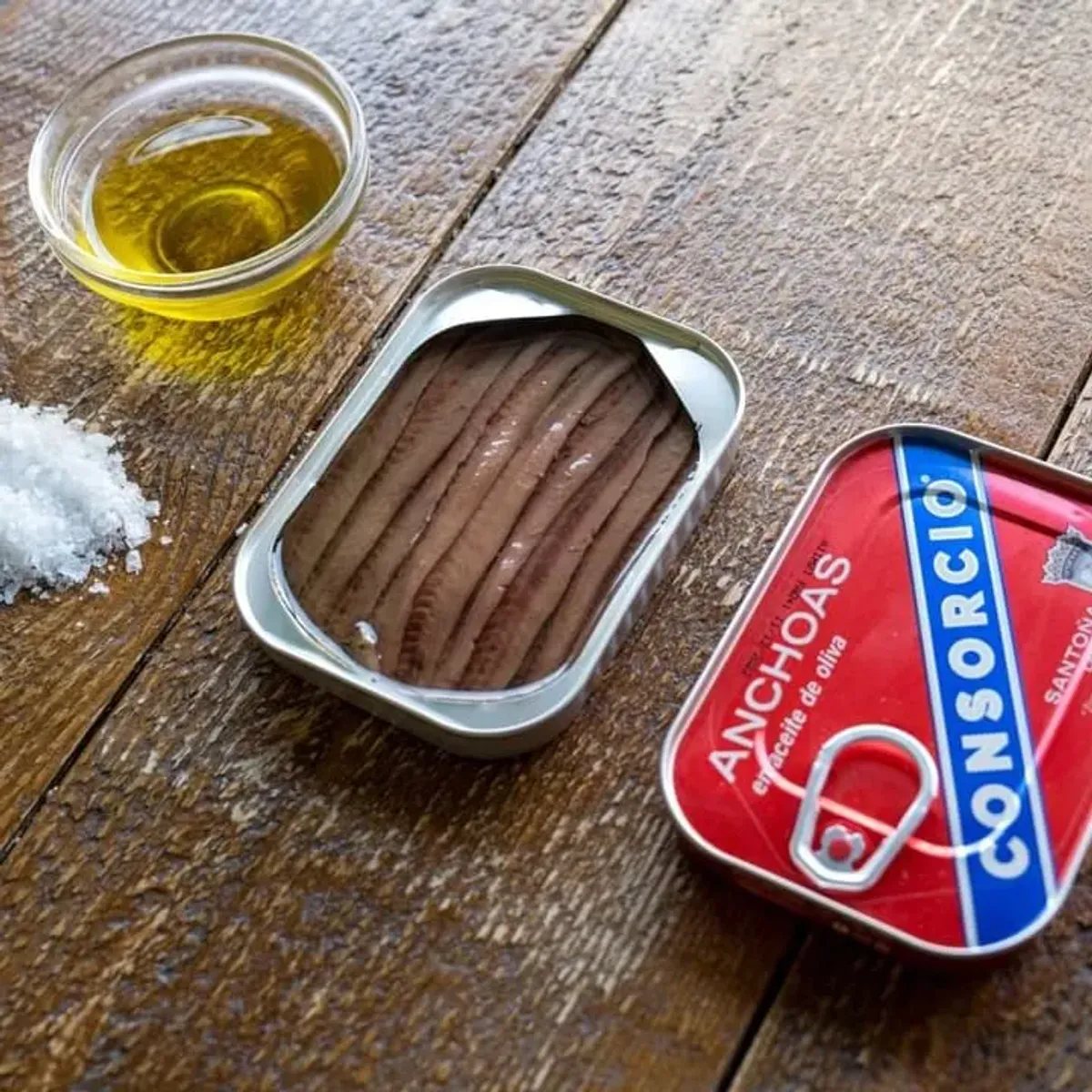 Ingredienser: ansjos (fisk), olivenolje og salt.