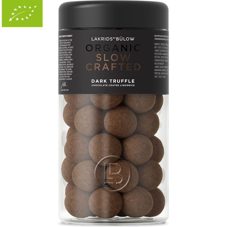 En herlig økologisk sjokoladegodbit med en spesiell overraskelse i kjernen. Sett tennene i den kakaopudrede Dark Truffle og møt et tynt lag av mørk sjokolade med fruktige noter etterfulgt av et mykt lag av kremaktig melkesjokolade. Og akkurat når du trodde det ikke kunne bli bedre, kommer du til den myke slow crafted-lakriskjernen, og nytelsen er komplett.