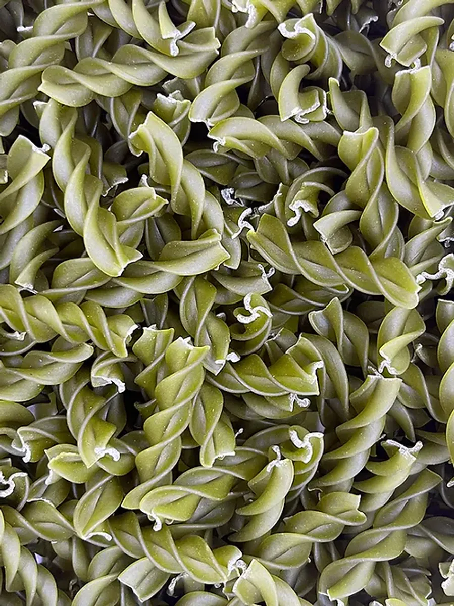 Økologisk, glutenfri pasta fusilli laget på mel av grønne erter.