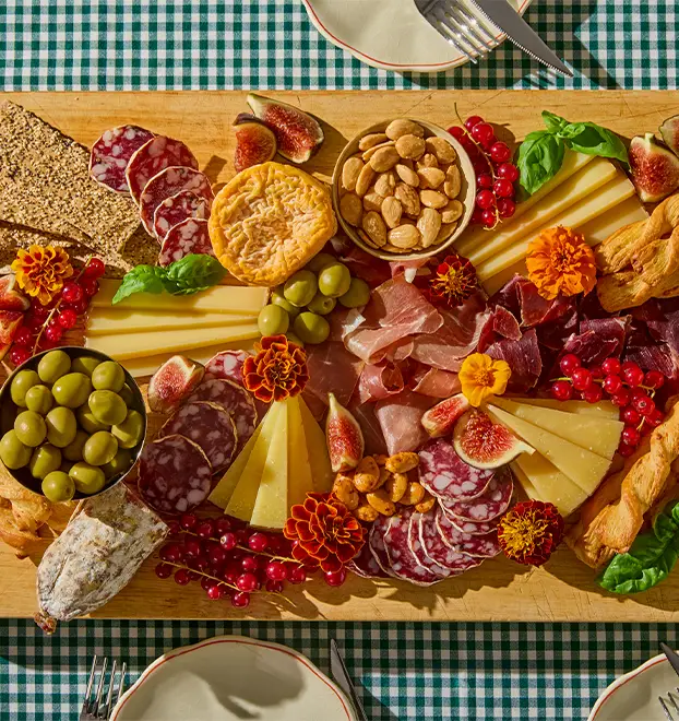 Et solid utvalg av Guttas utvalgte favoritter! Tre oster og tre sorter spekemat. Serveres med marmelade, pesto, aioli, oliven, kjeks, grissini, frukt og urter. Serveres på et flott fat, ferdig dandert. Her er det bare å løfte av lokket, og invitere til bords!