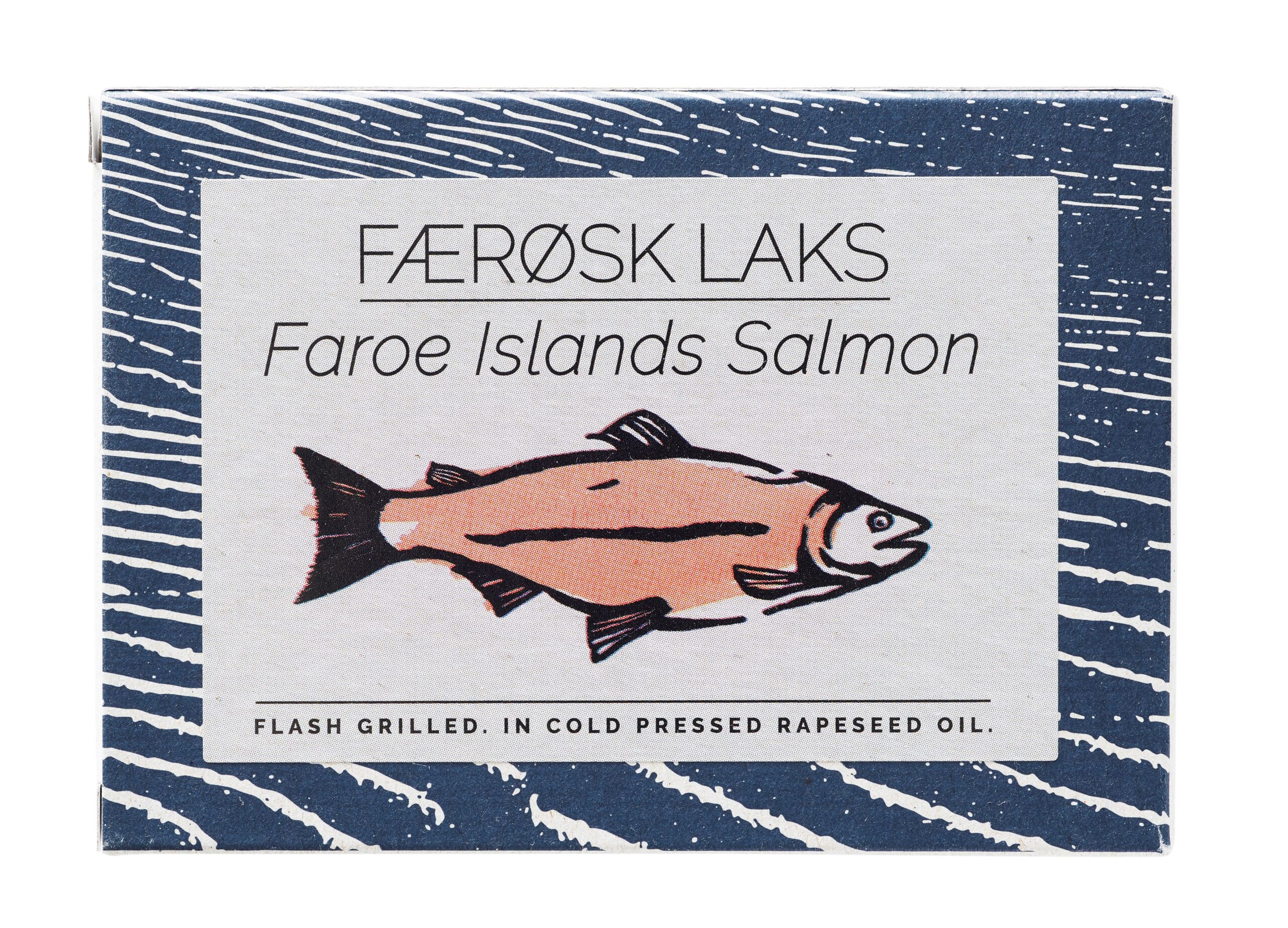 Tynne laksefileter legges kjapt på en glohet støpejernsgrill før de legges i boksen med kaldpresset rapsolje fra Bornholm.