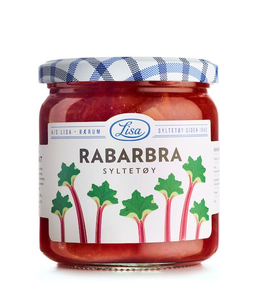 Rabarbra, sukker, fortykningsmiddel (karragenan), surhetsregulerendemiddel (sitronsyre), konserveringsmiddel (natriumbenzoat og kaliumsorbat). Laget av 60% frukt pr. 100 g vare
