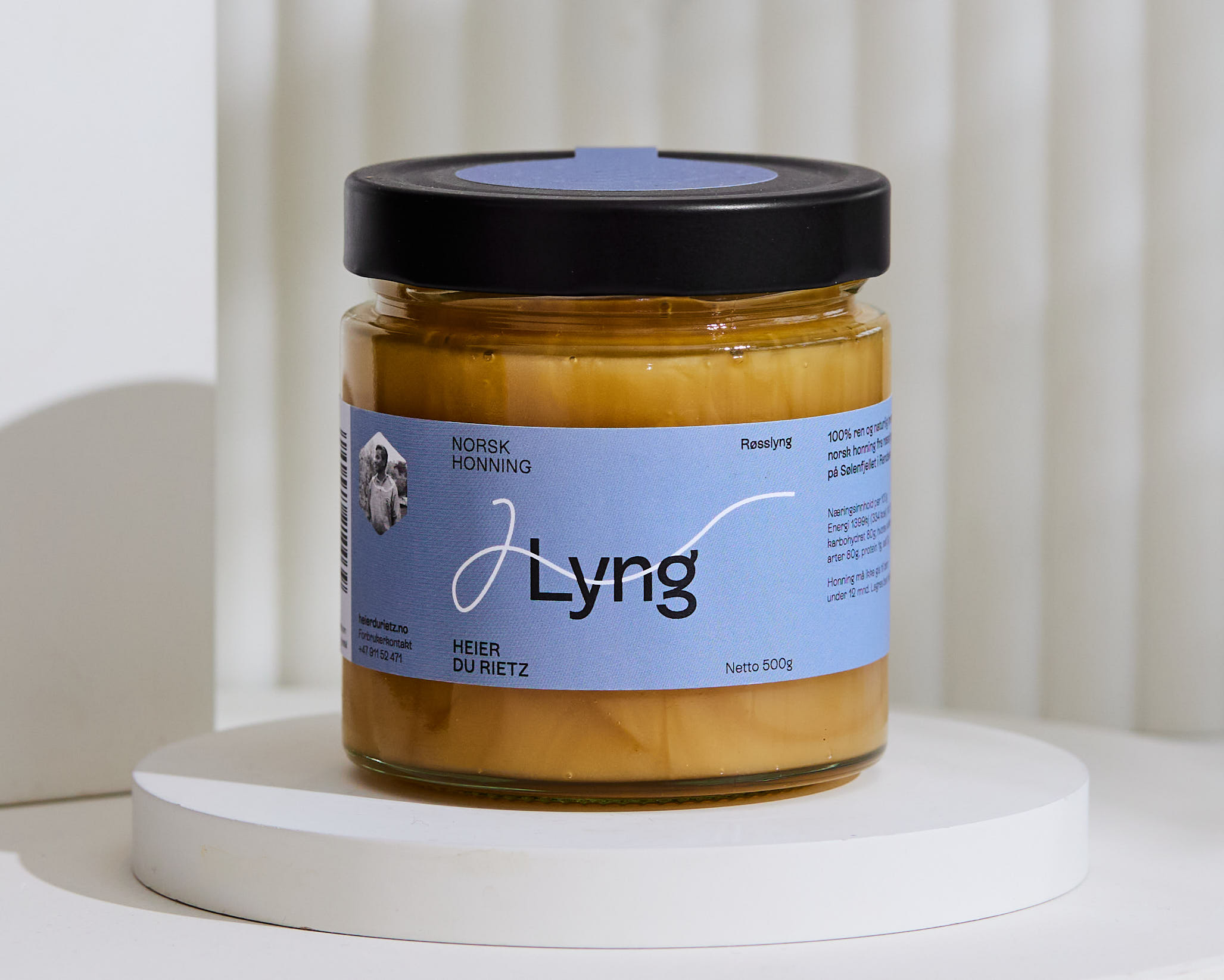 Lynghonning er også kalt fjellhonning, og produseres i det såkalte lyngtrekket når de har flyttet biene til fjellet. Heier Du Rietz bruker Sølenfjellet i Rendalen, der biene henter nektar fra røsslyngen som blomster i august. Denne nektaren gir en mørkere farge, en tykkere konsistens og mer intens smak som får deg til å drømme om fjellet. Delikat og lang ettersmak