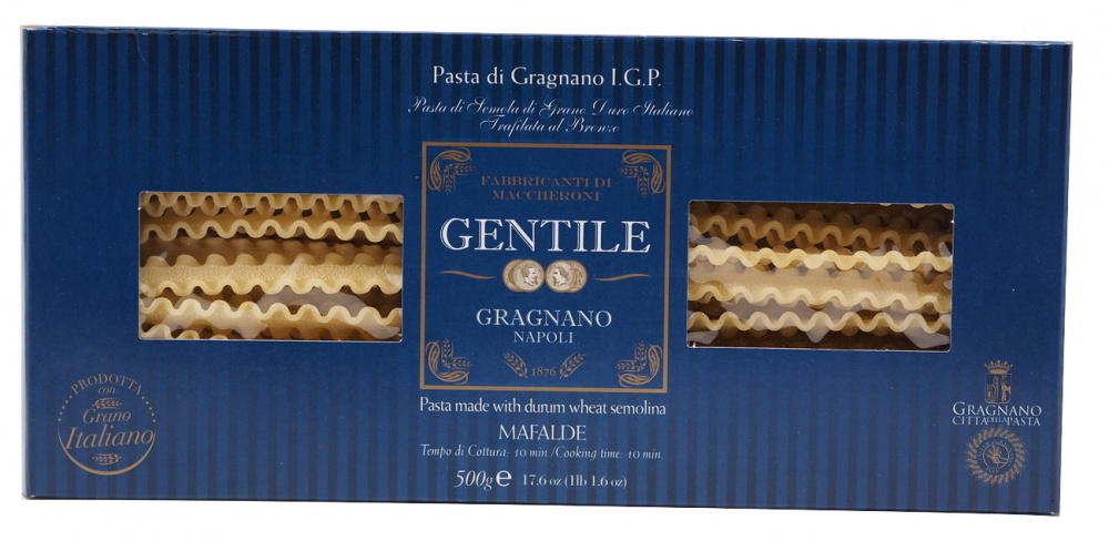I Napoli var Mafalde en gang kjent som «Fettucellen for de rike». Dedikert til prinsesse Mafalda. Dette er en lang, bred og flat pastatype som er smalere enn lasagne, men kan allikevel stå godt sammen med en rik krem eller kjøttsaus. Produsenten er Gentile, etablert i 1876. Fabrikken har levert pasta siden og er en av de historiske fabrikkene som har gjort Gragnano kjent for sin pasta. 500 gram i posen.