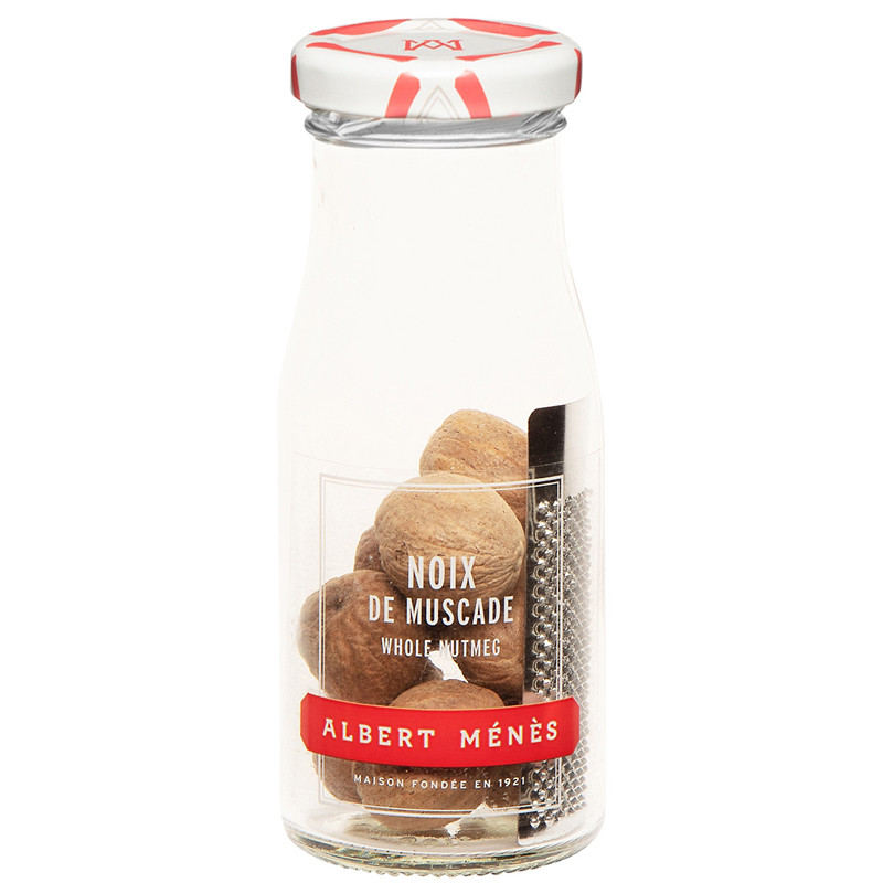 Muskatnøtt er kjent for å støtte fordøyelsen og er en av verdens mest verdifulle krydder. Albert Ménès velger ut hele muskatnøtter for deres utsøkte smak, vakre runde form og perfekte størrelse. Nøttene sorteres for hånd og pakkes i deres verksted i Frankrike. En liten rive er inkludert i flasken for enkel bruk.