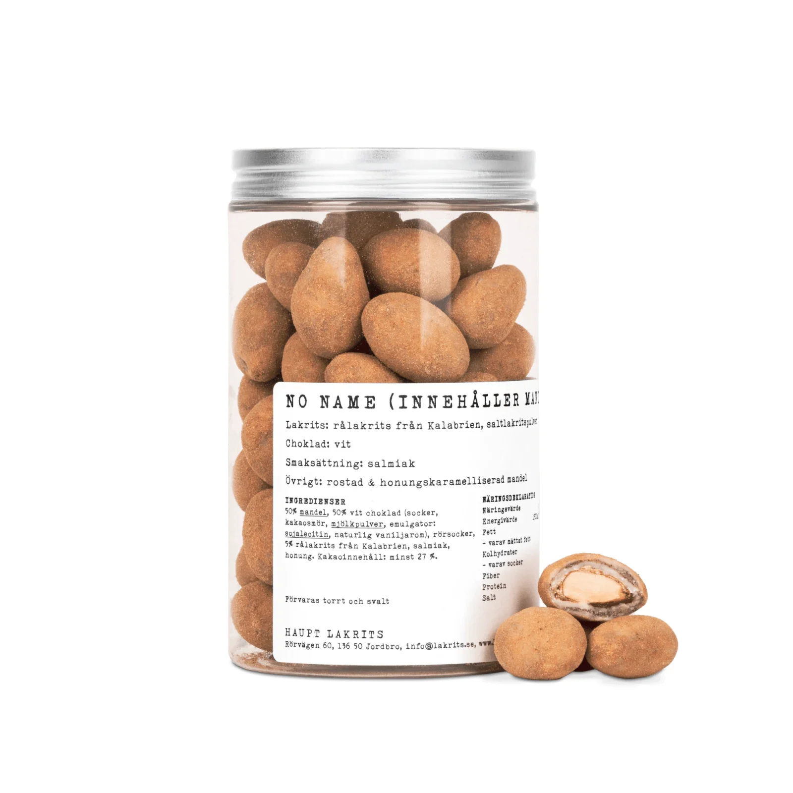 Ristede italienske mandler som er karamelisert i rørsukker og honning. Smaksatt så med 2 sorter lakris og en klype salmiakk. 250g