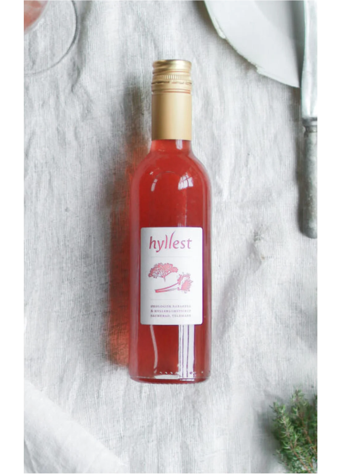 Laget med økologisk rabarbra og hylleblomst dyrket i Sauherad. I denne bruker vi hele 3 sorter rabarbra for best mulig smak. Rabarbraen er kokt opp, og har ligget i lake sammen med hylleblomster, vann, rørsukker og sitronsaft i 5 dager, før det hele blir filtrert og pasteurisert. Nydelig frisk smak og vakker rosa farge!