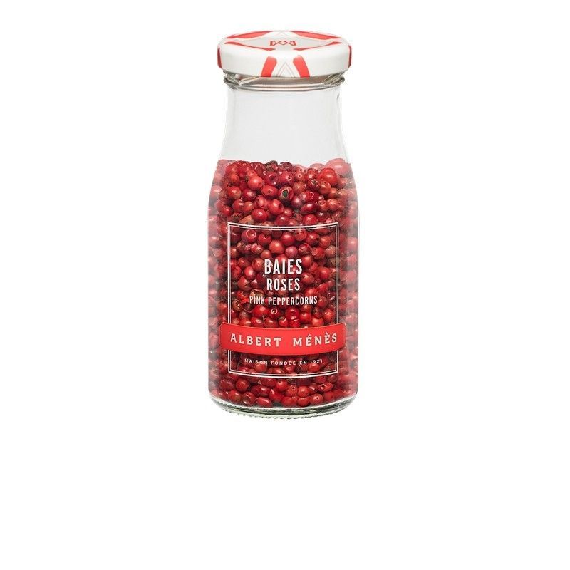 Rosépepper fra Albert Ménès. Pepperet er veldig aromatisk og distinkt, med en noe søtlig smak. Den fruktige aromaen gjør at den passer godt til fisk, men de kan også brukes i supper og sorbeter. Passer perfekt til rå fisk, salater og eksotisk frukt