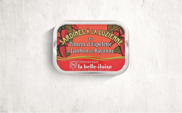 Sardines à la Luzienne, en Baskisk spesialitet. Sardiner med Jamon de Bayonne skinke smaksatt og espelette pepper. 115 g