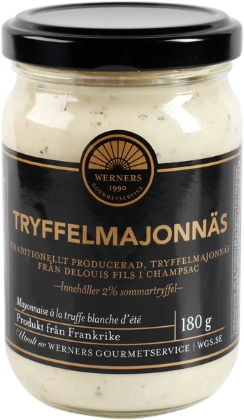 Denne gode trøffelmajonesen er lagd på klassisk vis med eggeplomme, eddikk, dijonsenepp, solsikkeolje og salt. For å få til den uimotståellige trøffeltouchen er den smaksatt med trøffelaroma og biter av hvit sommertrøffel. Perfekt til årets beste hamburgere.