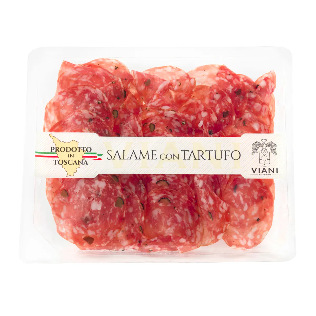 Klassisk toscansk salami med sort sommertrøffel. Denne egner seg godt på skiva, tapasbordet eller i en solid sandwich.