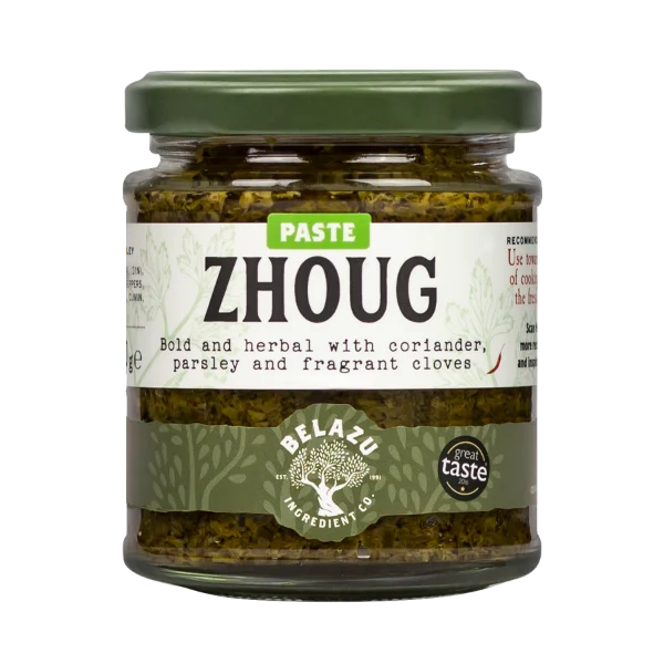 Zhoug er en paste bestående av koriander, nellik, persille og grønn chili. Pasten gir en frisk og spicy smak til grillede grønnsaker, kylling eller lam.